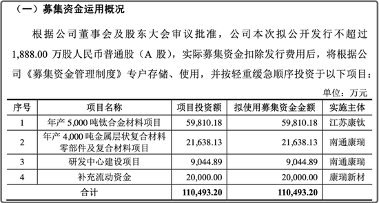 而在本次IPO策画中,康瑞新材拟召募资金约11.05亿元,用于投资年产5000吨钛合金材料样式、年产4000吨金属层状复合材料零部件及复合材料样式和研发中心建立样式及补充流动资金等。